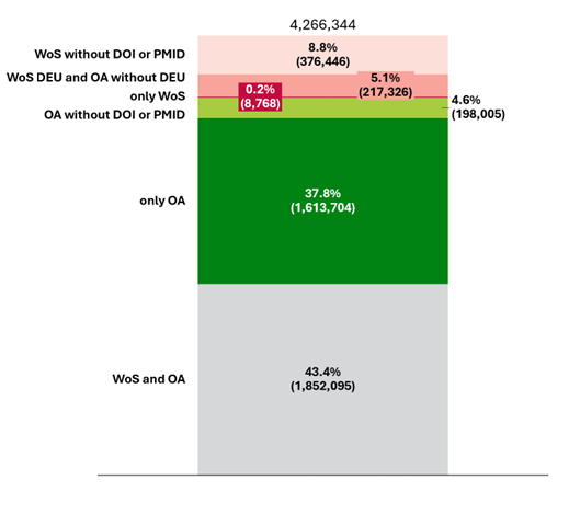 A further 1,811,709 publications are only contained in OpenAlex or could not be matched with WoS publications. The full outer join of the German publications in WoS and OpenAlex shows that there are 4,266,344 publications that are assigned to a German country code either in WoS or OpenAlex or in the two internal databases.
